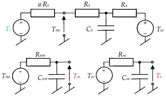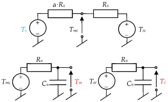 The authors argued that this behaviour may have been caused by the thermal capacitance of the clothing being overlooked in the experimental model. Furthermore, it may not be justifiable to assume that the clothing and external sensors share identical RC values: although they have identical constructions, their working conditions are significantly different. The external sensor relies solely on convective heat transfer, while the internal sensor is also influenced by thermal conduction. The final thermal model is presented in Figure 11. The change of temperature across thermal capacitance Cx, denoted Tcx, can be computed from Equation (4), and the skin temperature from Equation (5).