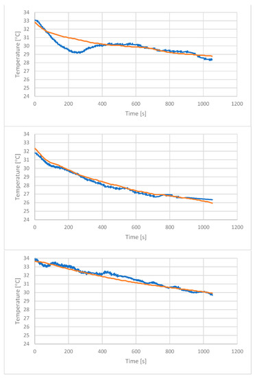 Reference (orange) and computed (blue) skin temperatures. From top: participant A, B and C. Note different time scale than in Figure 7.