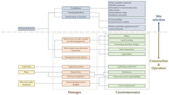 Based on the thematic analysis results, consequences to the power plants vary with size, location and existing countermeasures, starting from submersion of panels, inverters, and/or other apparatus [44], to soil erosion at the basement of the structure of the solar panels. Storms can also topple the trees or rip the branches near the transmission line [101], causing the outage of the electricity supply system which stops the power plant’s sales of electricity. Some owners build dikes or fill the land to avoid being flooded, some decide to leave with floods by increasing the height of the solar panel structure by 1–2 m. Soil compaction and agrivoltaic are the two available options to address the issue of soil erosion at the basement of the structure by helping with the soil retention [102]. Lightning which usually comes with storm is also another concern of the power stations. It may lead to insulation breakdown, grounding potential rise, and panel and/or inverter destruction [45]. Lightning conductors are thus installed at many power plants to minimize the damage from lightning. Though there have not been any fire events in all four interviewed key sites, three of them possess or have considered installation of firebreaks since there are lit fires during dry season within the proximity of the power plants. Even though the interview was centered around climate hazards, it can be seen from Table 6 that most interviewees touched upon human-made incidents, e.g., fireworks, skyrockets, and bullets. Most sites successfully mitigate consequences from these events by building good relationships with surrounding communities through corporate social responsibility (CSR) activities or employment of locals.