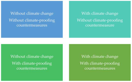 Figure 3 shows four different scenarios generally considered during the discussion on feasibility of climate-proofing countermeasures [108]. They are basically the combination of scenarios with/without climate change and with/without climate proofing countermeasure(s). Climate change is expected to increase the frequency and the intensity of climate events, e.g., high precipitation, storms, drought [42]. In case of solar power plants, this can potentially disrupt the electricity production or cause damages to equipment. Most climate-proofing countermeasures, whether hard or soft, result in additional expenses. Most assessment has been focusing on how to ensure economic feasibility of the countermeasures [108,109,110], and how to facilitate the climate-proofing investment [111]. However, as can be seen from the results from thematic analysis, this study focuses more on the details of the actual effects from climate change on solar power plants and the actual or planned countermeasures in order to derive policy recommendation to accelerate climate-proofing investment.