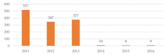 The volume of wastes generated in Poland, in the years 2011–2016, in the form of sugar beet pulp, is presented in Figure 2.