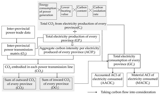 To analyze the CO2 embodied in the inter-provincial power transmission, the interprovincial power flow matrix must first be established, and the CO2 load on each line must be obtained. To this end, we must calculate the Aggregate Carbon Intensity per unit of electricity Produced (ACIP) in the province where the electricity flows out. The analysis scheme of this article is shown in the Figure 1.