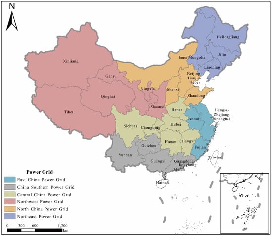 Limited by data availability, this study took mainland China’s 31 provincial-level administrative units, except for Hong Kong, Macao, and Taiwan, as research subjects. However, minor adjustments were made based on the spatial division of China’s power grids. In the North China Power Grid, the Beijing–Tianjin–Hebei region is divided into the Beijing–Tianjin–Tangshan Power Grid and the Southern Hebei Power Grid [36,37]. This division does not coincide with provincial boundaries, so this study merged them into one research unit. In addition, this study merged Jiangsu, Zhejiang, and Shanghai into one unit due to their close power connection. Therefore, there are 27 spatial units in this study.