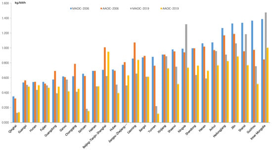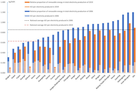 Existing studies have found that more than 30% of global energy-related CO2 emissions is attributable to emissions from electricity and heat production [34,45], mainly because of its heavy dependence on fossil fuels. As for China, the electricity generated by thermal power stations with coal as the primary fuel used to be more than 80% at the beginning of 21th century. There are two approaches to reducing CO2 emissions in the electricity production sector. One is to switch from using fossil fuels to non-fossil energy sources such as renewable energy; the other is to improve the thermal efficiency of electricity generation in fossil fuel powered plants [34]. Since the information on the thermal efficiency of electricity generation in the different provinces in the period was not available, this study assumed these provinces had the same level of heating and carbon content. Therefore, the spatial differences of CO2 emissions and ACIP would show the impact of the differences in fuel structures in the different provinces. Using Equations (1) and (2), the ACIPi is calculated from the perspective of the producers in different provinces in 2006 and 2019 as shown in Figure 4.