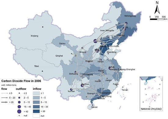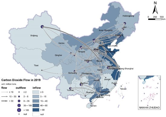 Because of the high loading of CO2 on power generation, inter-provincial power transmission also means the inter-regional flows of CO2. Using Equations (3)–(5), this study calculated the inter-provincial CO2 emission embodied in the inter-provincial electricity flow in 2006 (Figure 5) and 2019 (Figure 6).