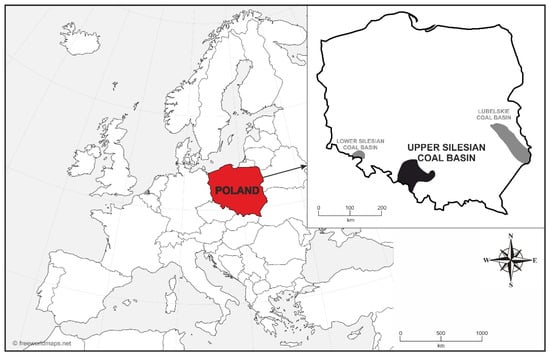 USCB is located in the southern part of Poland. It is the biggest coal basin in Poland and one of the biggest in Europe [33]. In the south, it passes into the territory of the Czech Republic in the Ostrava–Karviná region [34]. The area of the basin is about 7490 km2, including about 5760 km2 in Poland [35]. The location of the USCB where the research was conducted is presented in Figure 1.