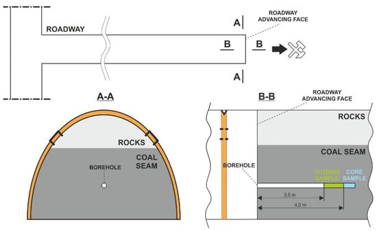The samples were taken from coal layers in the advancing face of the heading. Each sampling was carried out on a freshly exposed coal seam. The samples were taken as both drill cuttings and core samples. Drill cuttings and core samples were taken from the same borehole.