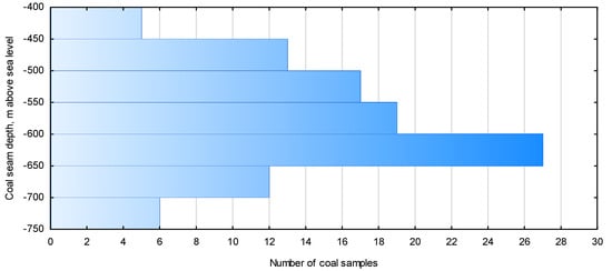 Figure 3. Histogram showing the number of samples taken for the tests in individual intervals of coal seam depth.