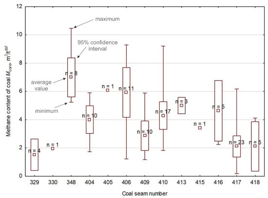 Figure 5 presents a box plot showing the variation of the methane content of coal is particular seams. The number of coal samples pairs are presented for each coal seams. In the plot, the middle point indicates the average value of the determined methane content of coal. The box represents the 95% confidence interval, while the whiskers represent the minimum and maximum values. A higher number of coal seams occurs deeper. The average methane content of coal for deeper coal seams reached higher values. This statement corresponds with other researches for USCB [33,37].