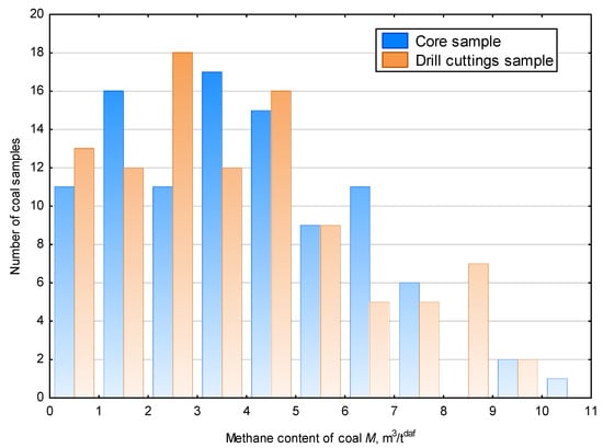 Within the planned research, the results of 99 pairs of methane content of coal determinations were compared, in which a sample was taken both in the form of a core and in the form of drill cuttings. In the case of the drill cuttings samples, the gas loss related to their collection for tests was added, which resulted from previously conducted studies and was accepted in the developed method remaining a Polish standard.
