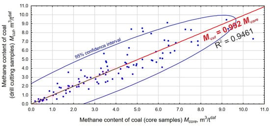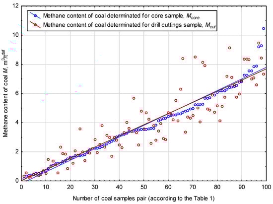 The plot in Figure 7 shows the variation in the methane content of the coal for the drill cutting samples corresponding to the core samples. Despite some differences in the methane content of the coal for particular pairs of samples, the linear approximation for all samples shows that the results reached, according to the core samples and drill cutting samples, are practically the same.