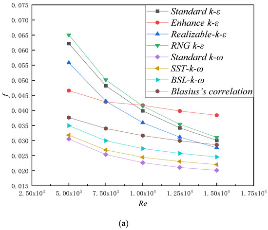 Similarly, the simulation results of f were compared with the results calculated by Blasius’s empirical formula. The formula of Blasius which used to predict for f was as follow:
