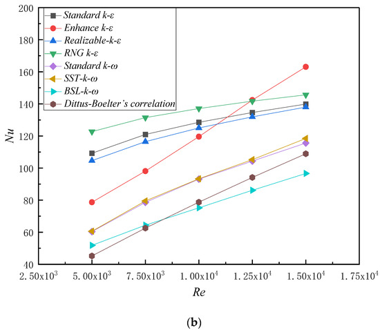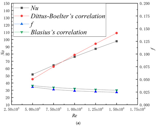 Figure 4a simultaneously showed the comparison of the simulated Nu and f in present work with the results calculated by Dittus-Boelter’s formula and Blasius’s formula, respectively. In order to compare and analyze the reliability of simulation results more intuitively, the relative errors of Nu and f between simulation research and calculated values were defined as the percentage errors. As seen in Figure 4a, the percentage error of Nu was relatively small, and the accurate value was only ±7.66%. The f obtained in the present work had good agreement with Blasius’s formula (Equation (25)). The value of percentage error was within ±12.11%. The percentage errors of Nu and f were both less than 13%, and these errors might be caused by the uncertainty of calculation parameters. Hence, it could be determined that the simulation results for the circular tube were highly consistent with the results calculated by the empirical formula.