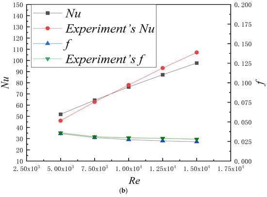In order to make the simulation results more compelling, some experiment results of tube with RWVG inserts in Ref. [44] were also used to verify. Figure 4b displayed the comparison between simulated results and experimental results. As seen in Figure 4b, the percentage error of Nu was ±6.45%. The simulated f also matched with the experimental result and the value of percentage error was ±7.42%. Therefore, it further showed that the simulation technique and results in this paper were reasonable and reliable.