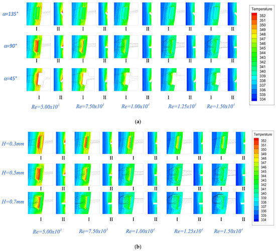 Revealed in Figure 5bI, it showed that two vortices were generated when the working fluid flew through a VG. Two vortices were both located in the back of the VG. When air struck the surface of VG, the increase in flow velocity led to increased divergence of spiral streamlines, then the intensity of turbulence had been significantly improved, it was undoubtedly beneficial to the heat transfer enhancement in the tube. Figure 5bII showed that the local temperature around RWVGs was relatively high due to the configuration of RWVGs, while, as the Reynolds number increased, the temperature distribution gradually became uniform in the tube with RWVG inserts. From a vertical perspective, due to the increase of height H, the high temperature region near RWVGs became significantly smaller when the value of Reynolds numbers was between 5000 to 7500.
