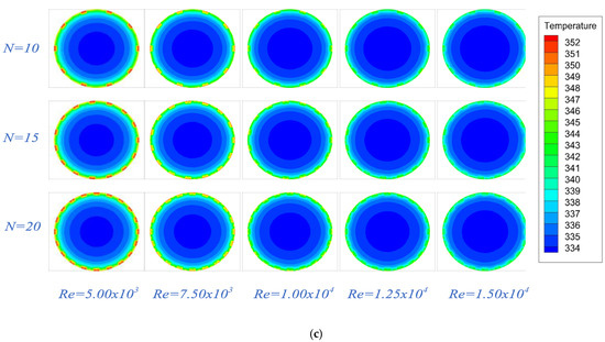 As shown in Figure 5c, the temperature field distribution in the tube was relatively uniform no matter what the value of N was. It was not difficult to distinguish that the temperature around the RWVGs was the highest in the tube.