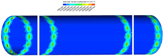 The distributions of the local wall heat transfer coefficient were displayed in Figure 6. It was not difficult to obtain from the figure that the heat transfer coefficient of VGs surface area was much greater than that of other areas. The main reason for this phenomenon was that the surface of VGs was directly crashed by the fluid in the pipe. In addition, the heat transfer coefficient at the rear region of VGs was relatively high, and the strong vortex intensity would form the vortex in this area.