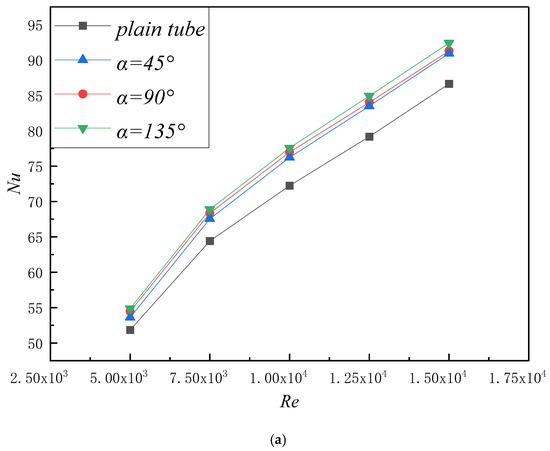 Figure 7 compared the thermohydraulic performance of ordinary circular tube and smooth tubes with RWVGs (α = 45°, α = 90°, α = 135°). Figure 7a showed the relationship between Re and Nu in circular tube and tubes with RWVG inserts. It can be clearly seen from Figure 7a that the trends of Nu change in circular tube and RWVG inserted tubes were almost the same. In addition, the Nu of three different RWVG inserted tubes were much larger than that of ordinary circular tube under the same Reynolds number. This directly reflected that the RWVG inserts greatly enhanced the heat transfer performance in the circular tube. What’s more, as the Figure 7a showed, with the increase of Re, the deviations of Nu between tubes with RWVG inserts and plain tube became larger and larger when the range of Reynolds number was less than 7500. However, this trend was not obvious when the value was more than 7500.