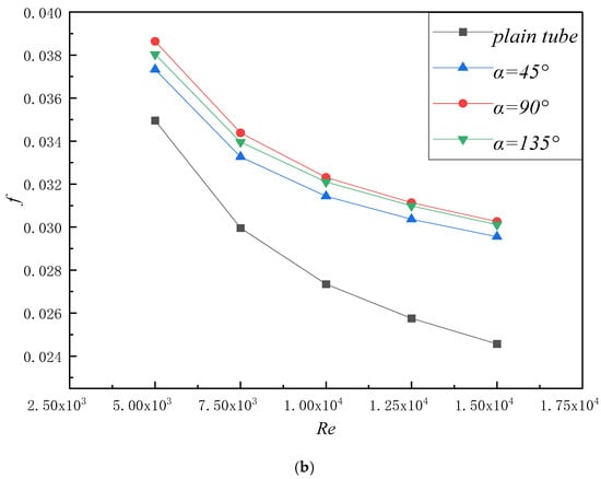 Figure 7b showed the relationship between f and Re of three kinds of RWVG inserted tubes (α = 45°, α = 90°, α = 135°) and circular tube. In general, the trend of f in RWVG inserted tubes (α = 45°, α = 90°, α = 135°) and ordinary circular tube were roughly the same. Generally, the values of f gradually decreased as the Re increased. And in details, as the Re increased, the downward trend of the f values became more and more gentle. Similarly to the Nu, the f of tubes with RWVG inserts (α = 45°, α = 90°, α = 135°) were significantly greater than that of circular tube under the same Reynolds number. And with the increase of Re, the difference of f between tube with RWVG inserts and circular tube became larger and larger.