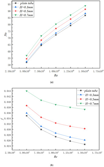In order to investigate the effects of RWVG inserts on thermo-hydraulic characteristics of flow in smooth tubes, Nu and f were plotted in Figure 8 for a range of height H. Similar to the line distribution of Figure 8a, the Nusselt number was almost proportional to the Re in all the cases. The increase of Nu could be proved that the enhancement of heat transfer had been achieved in all the cases with different height under the same Re. Furthermore, it could be clearly found that Nusselt number has little change when the height of RWVGs was 0.3 mm, however, when the value of H was 0.5 mm or 0.7 mm, the increase in heat transfer performance of the tubes were undoubtedly considerable. And the best performance of heat transfer could be obtained when the value of H was 0.7 mm in this paper.