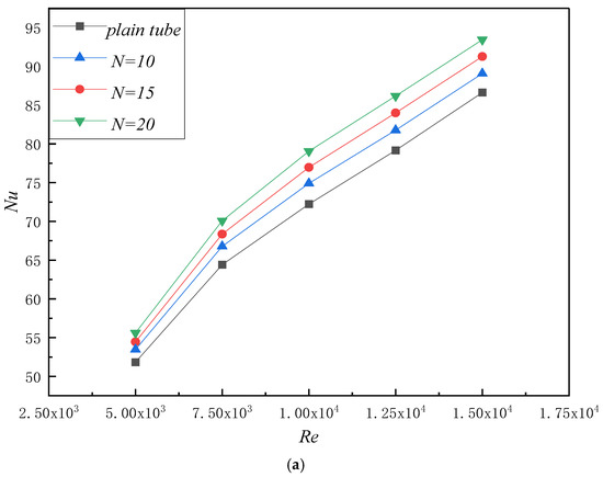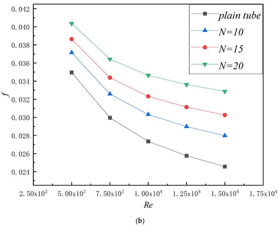 Figure 9 generally presented the thermal performance of the plain tube and tube inserted with different numbers of RWVG in a circle. Except that the overall trend is almost the same as the above analysis, it could be clearly seen that the changes between adjacent curves were evenly distributed in Figure 9a. Compared Figure 9a,b, it could be found that the gaps of f were fairly larger than that of Nu at the same Reynolds number. In details, the gaps increased when the Re increased in the range of 5000 to 15,000. In general, both Nu and f increased with the increase of N, the reason for this phenomenon could be speculated as: the enhancement of heat transfer around the RWVGs was greater than that of further region and the increase of the number N would make the external region of RWVGs more expanded.