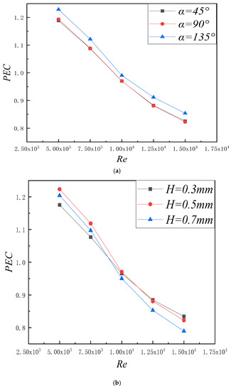 On the basis of the previous analysis, Figure 10 illustrated the variation in the PEC values of the tube with RWVG inserts. It was not difficult to obtain a better thermal performance in the tube when the Re was less than 7500 and the PEC values vary between 1.10 to 1.23. As shown in Figure 10a, the tube with RWVG inserts achieved the most ideal thermal performance when the value of α was 135° in this paper. In addition, Figure 10b showed that, when the height H was less than 0.5, the PEC increased; However, when the height H was greater than 0.5, the change of PEC was relatively small, and there would even be a downward trend under the condition of high Reynolds number. So H = 0.5 mm was recommended for practical applications when considered the comprehensive performance in this paper. In this case, PEC had not changed much under the same Reynolds number, as seen in Figure 10c.