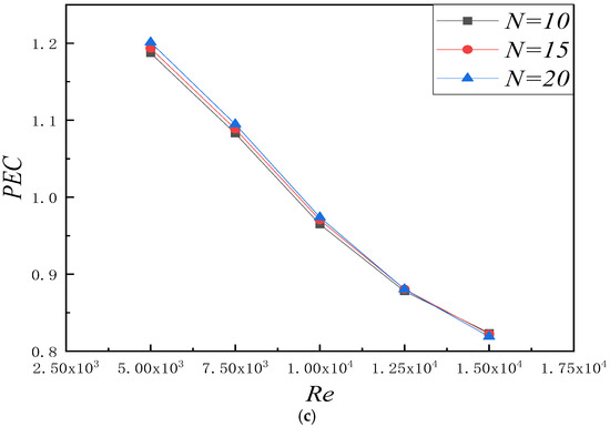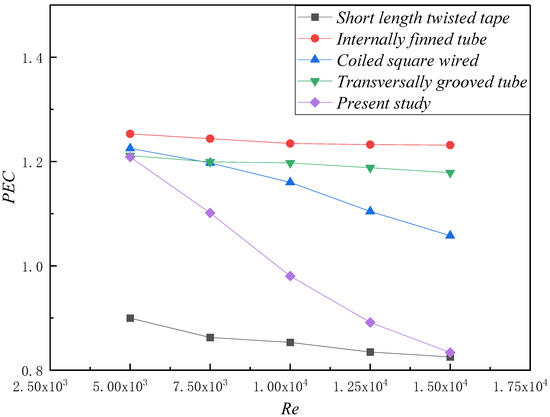 Webb et al. [40] proposed a method to evaluate the performance improvement of strengthened tubes compared with smooth tubes of the same diameter. This method evaluated the performance from the perspective of energy balance. PEC, a performance evaluation index in convective heat transfer process, was generally obtained at the cost of flow resistance ratio and the benefit of heat transfer ratio between strengthened tube and smooth tube. Therefore, PEC should be considered in this section.