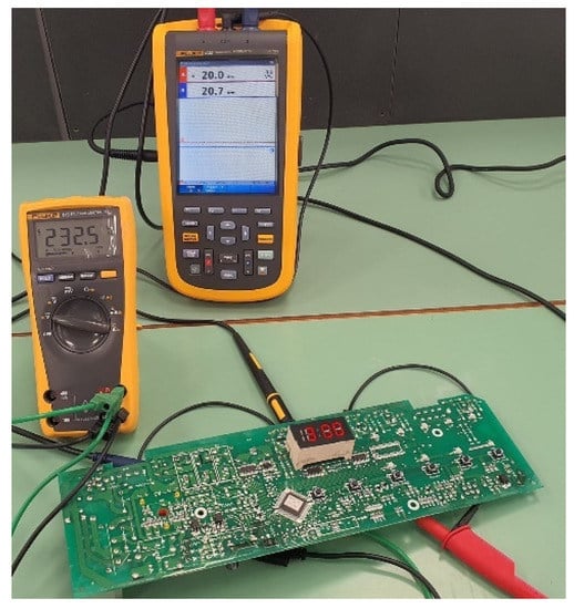 Experimental arrangement for AC/DC voltage and current measurements considering a PCB of a washing machine.