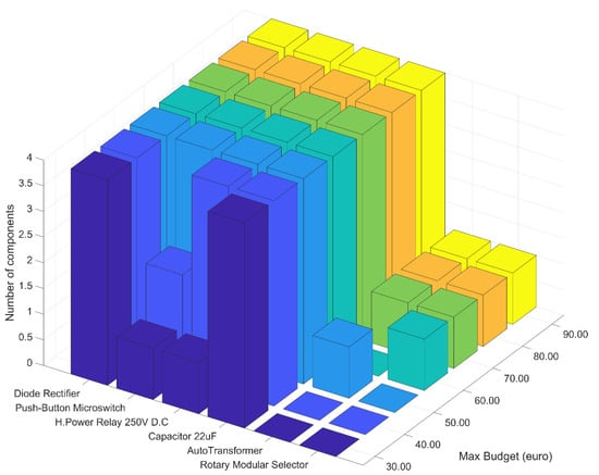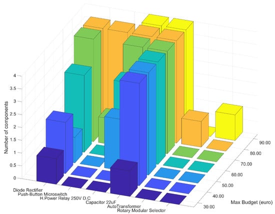 Graphical representation of PCB components considering different maximum client budgets for a dishwasher machine and differentiating the cost of Diode Rectifiers, H. Power Relays, Capacitors and Rotary Modular Selectors to 1.60 EUR, 6.30 EUR, 2.65 EUR and 26.58 EUR, respectively.