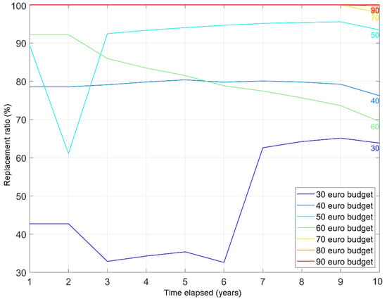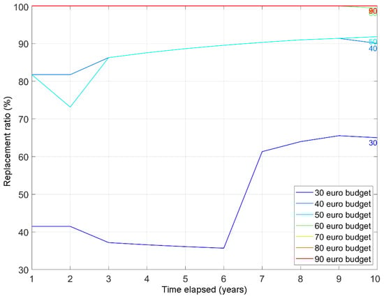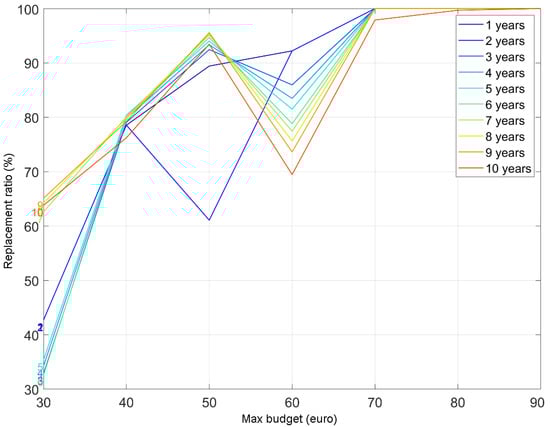 From the results of Figure 7 and Figure 8, it can be observed that as the customer’s budget increases, the replacement ratio for the maintenance of the PCB also increases. The benefit of replacement for a low budget varies, depending on the time elapsed. This is because it seems more beneficial to replace certain cheaper components after a few years than replace some more expensive components earlier. This takes into consideration that any part of the PCB is essential for its operation and a replacement of a single part increases the PCB’s health by an amount equal to the aging percentage of the replaced component. Note that, in the first two years, three PCB components need to be replaced due to their aging, namely, the Rotary Modular Selector, the H. Power Relay {250 V D.C-250 V A.C} and the H. Power Relay {12 V D.C-250 V A.C}. After the replacement of this set of components in the first two years and assuming a maximum budget of 50 EUR, the replacement ratio, expressing the benefit to the health of the appliance, is rapidly increased. As a result, for a washing machine, at a budget of only 50 EUR, it is manageable to achieve a health benefit of 92.4% after 3 years, while for a dishwasher, with the same budget, the health benefit reaches 86.3%. However, assuming the same budget, the replacement ratio drops to 61.1% after 2 years for the washing machine, while it rises to 73.1% for a dishwasher, respectively. It seems more beneficial to perform maintenance of the PCB at 3 years with a budget of 65 EUR achieving a replacement ratio of 92.5% for the washing machine’s PCB, while a budget of 54.5 EUR is needed for the dishwasher. Figure 9 and Figure 10 present the replacement ratio % versus the maximum client budget expressed in EUR considering the operational years. As was expected, the replacing of the PCB components extends the PCB’s lifespan, and the lifespan of the appliance is also extended.