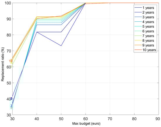Replacement ratio % versus maximum client budget expressed in euros considering the operational years for a washing machine’s PCB.