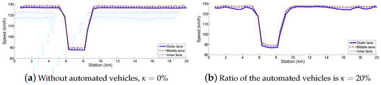 Function can be effectively formulated through polynomial relationships []. An example of , which depends on the and the presence of automated vehicles in the traffic, is illustrated in Figure 6.