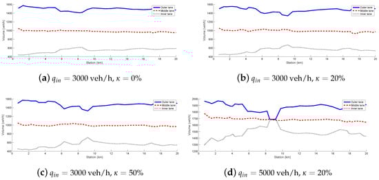 Figure 2 shows further examinations of the traffic flow in the distinct segments of the highway. q denotes the inflow of the motorway (veh/h). Figure 2a,b show the results of the scenario in the cases of the previous example, i.e., and , respectively. In these examples, the inflow into the highway section is veh/h. Figure 2c presents the result of the scenario, in which the ratio of automated vehicles is . Moreover, Figure 2d presents the result of the scenario, in which the inflow into the highway section is significantly increased to veh/h, and . Through the illustrations, it can be concluded that increasing the ratio and/or increasing the inflow has a significant impact on traffic flow.