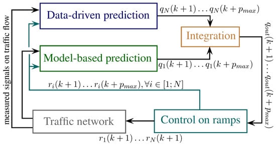 The prediction and control process is illustrated in Figure 3. The proposed prediction method has two components, namely data-driven prediction and model-based prediction. Their outputs are the predicted flow volumes at the end of the highway section on a horizon. The outputs of the predictions were integrated into a final prediction , which is used in the control process. The output of the control comprises the controlled inflows on N number of ramps on horizon . The control inputs on the entire horizon are used in the prediction process and their values at the step are used as control inputs of the traffic network. Different measurements on the traffic network for each prediction block are used as inputs and thus, the control loop is closed.