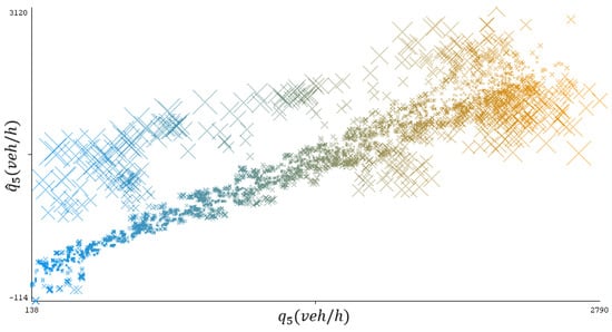 The data-driven analysis based on the results of a large number of traffic simulations was performed. In the analysis, the data-mining WEKA software was used, in which the pace regression algorithm was implemented []. The analysis yields linear regression for in the form of (8). Throughout the analysis, past data were also considered with a 5 min horizon backwards. The subset selection has 6 relevant attributes, which are , and .