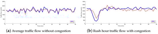 Time-domain simulations of the examination are shown in Figure 5. Two scenarios are illustrated, i.e., an average traffic flow veh/h and a rush traffic flow veh/h with a congestion at the beginning of the simulation. Figure 5 illustrates that the generated prediction model is able to accurately approximate in both scenarios.