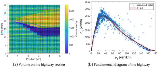 In this section, the effectiveness of the proposed method is illustrated through simulation examples. In the examples, a 5 km-long highway section with three lanes for was selected illustration purposes. In the example, was set, meaning that the traffic flow contains a significant number of automated vehicles. Several simulations were performed in the VISSIM traffic simulator in order to determine the function . The illustration of a selected scenario is shown in Figure 7a. Figure 7a shows the variation of traffic flow volume, depending on highway section (axis X) and on time (axis Y). Here, the values of the volume in several small sections of the highway depending on the time are shown. There is a congestion at the end of the highway section at 10 min, which has a significant impact on the entire highway section. The reduced traffic flow has reached the 1 km section point at 20 min. The example shows that the dynamics of the traffic flow is close to the experience in the context of highway scenarios. In the illustration, the simulated data are synchronized, which is guaranteed by the data acquisition process in VISSIM. Figure 7b shows the derived fundamental diagram of the highway. The data for the determination of were obtained by various VISSIM simulations. The volume–density pairs of all simulation scenarios on this figure were matched through their time stamp in VISSIM. was approximated to a sixth-order polynomial form.