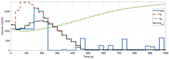The operation of the controlled system is shown in Figure 9. In the example, the 5 km-long-highway section has an on-ramp at the highway segment 1 km. The inflow on the ramp r can be controlled by traffic light. The purpose of the control is to guarantee the maximum outflow at the end of the highway section through the actuation of r. The inflows represent a traffic scenario, in which there is a rush hour in the middle of the simulation. The inflow is shown in Figure 9a and the inflow demand on the on-ramp is shown in Figure 9b. The inflow is limited by the computed r, which results in the real inflow . In the simulation, the variation limit is set to veh/h. Another result of the min–max optimization task is , which is illustrated in Figure 9c. The limits of are veh/h and veh/h. The role of the computation of is to characterize the worst-case scenario. For example, between 250 s and 1000 s, the worst-case is , which facilitates reduced outflow through a congestion. Although overestimates the real value of the unknown , it guarantees the avoidance of the traffic jam. The achieved outflow of the highway is illustrated in Figure 9d. It can be seen that the performance of the control, i.e., the maximization of the outflow, is achieved.