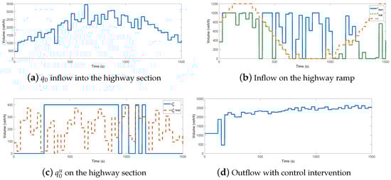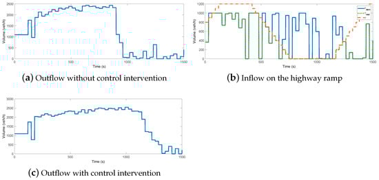 Figure 10 presents two counter examples to illustrate the effectiveness of the proposed control strategy. Figure 10a illustrates the scenario without control, which means that the inflow enters the highway. Due to the increasing and , the traffic flow on the highway is over saturated, which leads to a congestion, between 900 s and 1500 s. The comparison of Figure 9d and Figure 10a shows the effectiveness of the traffic control system, i.e., the outflow is significantly higher due to the avoidance of congestion.