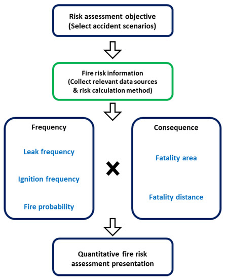 Quantitative risk assessment is expressed as multiplying the frequency by consequence of a hazard factor leading to an injury or disease. In the case of frequency, it is the probability of occurrence of accidents and diseases for hazardous and dangerous work. In the case of consequence, it is the degree of exposure to human and material damage. As such, the quantitative fire risk assessment risk is a method of predicting the degree of risk for multiplying the frequency by consequence values of fire, according to the accident scenario, which are dependent on various parameters. Finally, after the quantitative risk assessment, it establishes mitigation to solve the workplace risk factors, such as installing emergency warning devices and securing a minimum safety distance [2,4,15]. Quantitative fire risk assessment consists of five methods, as shown in Figure 1 [16]. This section is introduced based on quantitative fire risk assessment to perform this research.