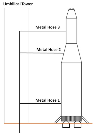 Schematic of metal hoses connecting the rocket to the umbilical tower.