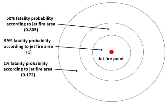 The fatality of a jet fire is calculated from the thermal radiation. In the case of the jet fire fatality probability function, the Equation (3) considering the thermal radiation exposure time to the target and the thermal radiation flux is used [17,29,30].