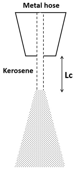 As shown in Figure 4, the atomization of the leak jet occurred at a constant breakup length. Miesse [20] had and established Equation (7) for calculating the atomization length. The Equation (7) was suitable for the density range 300 to 1500 kg/m3, and viscosity range 0.01 to 10 cp conditions. The position where kerosene atomizes can be calculated as follows [32]: