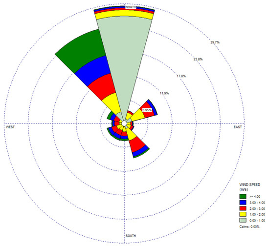 - Thé, J.L.; Thé, C.L.; Johnson, M.A. WRPLOT View Release Notes; Lakes Environmental: Waterloo, ON, Canada, 2018. [Google Scholar]