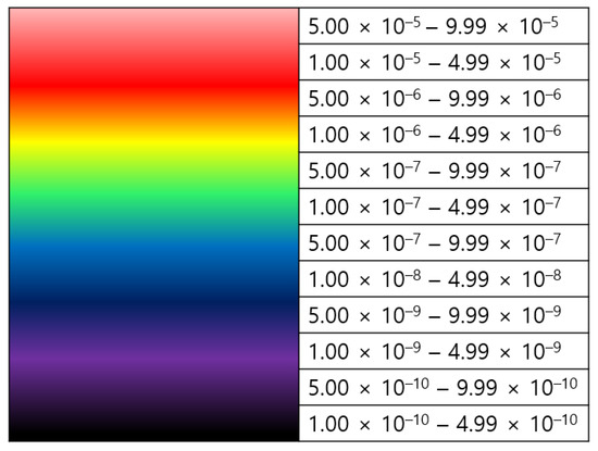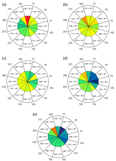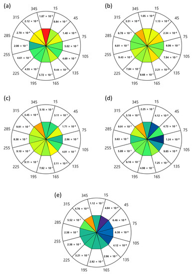 Table 7 presents the values of the terms in Equation (10). Figure 5 lists the IR ranges by applying different colors to visually express the IR result values derived through Equation (10). The colors in Figure 6 are used in Figure 7, Figure 8 and Figure 9 to visualize IR according to the wind speed and direction for each fatality probability. Figure 7, Figure 8 and Figure 9 show the results for 99%, 50%, 1% IR. For Table 7, all probability values of the wind rose are omitted since they are listed in Section 2.5.
