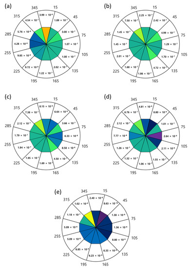 IR of 1% fatality at different wind directions and speeds: (a) 0–1 m/s, (b) 1–2 m/s, (c) 2–3 m/s, (d) 3–4 m/s, and (e) >4 m/s.