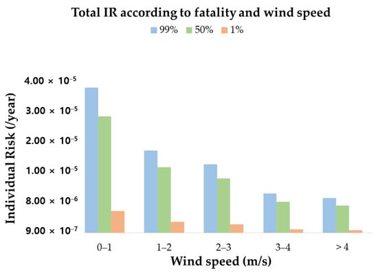 The IR results were calculated for the areas corresponding to 99%, 50%, and 1% fatality in each wind direction. The total IR was calculated for each wind speed. For the case of 99% fatality, the highest IR was at 345°–15° for a wind speed of 0–1 m/s and at 315°–345° for wind speeds >1 m/s. The lowest IR was at 255°–285° for a wind speed of 0–1 m/s, 75°–105° for wind speeds of 1–4 m/s, and 15°–45° for wind speeds >4 m/s. For the case of 50% fatality, the highest IR was at 345°–15° for a wind speed of 0–1 m/s and 315°–345° for wind speeds >1 m/s. The lowest IR was at 255°–285° for a wind speed of 0–1 m/s, 75°–105° for wind speeds of 1–4 m/s, and 15°–45° for a wind speed >4 m/s. For the case of 1% fatality, the highest IR was at 345°–15° for a wind speed of 0–1 m/s and 315°–345° for wind speeds >1 m/s. The lowest IR was at 255°–285° for a wind speed of 0–1 m/s, 75°–105° for wind speeds of 1–4 m/s, and 15°–45° for a wind speed >4 m/s. The IR showed the same tendencies at 99%, 50%, and 1% fatality. The total IR was high at 0–1 m/s, which was the most frequent wind speed; this indicates a high probability of IR when a jet fire occurs.