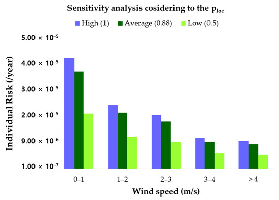 where is the frequency of event outcome j; and are the probabilities of fatality and weather conditions produced by event outcome j (from meteorological data, 1 for weather independent event outcomes), respectively; is the probability of the direction required to produce event outcome i (related to the wind rose and cloud width for gas dispersion events, one for omnidirectional events). For the sake of simplicity, the following assumptions are used to calculate the individual risk [19,27,28]: