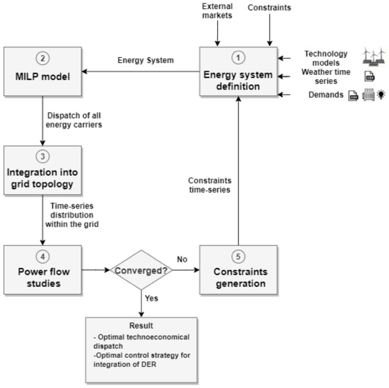 - Constraints generation: Similar to the constraint generation for the linear optimization [27], the oemof-Solph model will be limited by constraints generated from the OPF as denoted in Equation (4). Power time-series are the link between the two tools. Therefore, PowerFactory and oemof-Solph will exchange information about the active power flows, being the reactive power flow after the last OPF calculation considered as optimal.To build the OPF problem, the following objective function and constraints are considered:In Equation (11), the term for the thermal boiler is not considered. This is due to the fact that only electric units are taken into consideration in the OPF. The set is a sub set of T comprising only the periods of time that led to grid violations from step 4. The variables and denote the optimized power flows to avoid such violations. The constraints (12) and (13) ensure that the nominal capacity of any line of the system is not violated by the actual power flow . The set of all lines in the energy system is denoted by L. The actual power flow in the line is given by the square root of the sum of squares of the real power and the reactive power . To ensure voltage compliance, the constraint (14) is included. This keeps the voltage magnitude of all buses in the system, denoted by the set B, within of the nominal voltage . The constraint (15) limits the power that can be drawn by the batteries. The difference between the battery system capacity and the battery system energy content at the previous time-step provides the available energy to be drawn for charging the batteries. The energy content is provided from the linear optimization performed in step 2. The difference is divided by in order to get the charging power limit. A lower energy bound is given to allow the discharge of the batteries. This lower bound is equal to the negative of the energy content. In the OPF additional flexibility is provided with the PV system. The optimizer can reduce the power output as per constraint (16). Furthermore, to keep the thermal limits of all technologies within acceptable ranges, constraint (17) is included. Where the apparent power of each technology of the set N must not exceed the nominal apparent power . Similarly to the linear optimization, constraint (10) must be complied by the OPF, therefore:In Equation (18), the superscript denotes the power flow obtained from the OPF from the respective source or sink. Considering that and , Equations (18) and (9) can be combined to yield:Equation (19) shows how the changes in the OPF have to be compensated by the heat elements in the energy system. However, as previously indicated, the OPF only takes into consideration the electric components and the sector coupling technologies. Therefore, the changes in the OPF have to be reflected in the linear optimization. Equation (20) is employed to determine the deviation between the OPF and the initial power flow.The power flow per technology resulting from the OPF is represented by , whereas the initial power from the linear optimization is represented by . Whenever , the value of the OPF is passed as an upper bound in (4) for the linear optimization in the next iteration.