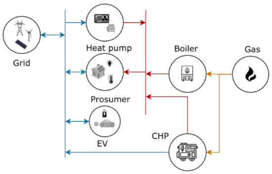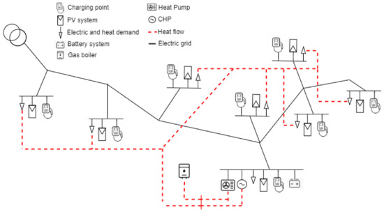 Figure 2. Simplified example of an energy system structure representation in oemof-Solph and the energy flow between sectors. The blue lines represent the electrical part of the system, whereas the red and orange represent the heat and gas sectors, respectively.Costs and additional constraints can be associated with each of the energy flows [23]. Here, the system will only consider the economical constraints of the energy flows. Therefore, the objective function is the cost minimization. From Equation (1), the following objective equation is derived for the considered energy system:where represents the imported or exported electric power from the external grid, the day ahead price for a given time, and the gas import for the CHP and boiler, respectively, and represents the cost of gas. The power given or provided to the external grid at a given time is given by . The electric generation and electric loads can be defined as follows:In Equations (7) and (8), the parameters and refer to the PV generation and the CHP electric power generation within the system, whereas the parameters , , , and refer to the electric demand, the battery power consumption, electrical vehicle charging, and the heat pump demand, respectively. Every storage unit (including EVs) has been considered as a load. That means that a negative power represents a power injection to the system. The same convention has been used for the external grid power flow. As constraints for the optimization problem, the thermal and electric demands must be supplied at any time. Equations (9) and (10) depict such constraints where , , and are fixed time series.As a result, the optimized power dispatch for each non-fixed source to supply the demand at each time step is obtained. However, up to this point, just the total installed capacities and demands have been considered as per the inequality (4). The actual topology of the electrical and thermal grid has been also disregarded as a common practice in the optimization of energy systems [19]. - Grid topology consideration: Before integrating these flows into the electrical grid in PowerFactory, the flow distribution must be considered. This applies only to the electric sources, sinks, and sector coupling technologies. The distribution of heat technologies is disregarded since only the electrical grid topology is being considered in this study.To represent a typical low voltage grid, one of the so-called “Merit Order Netz-Ausbau 2030” (MONA) reference grids is used. The ONT_8003 grid model is used as reference [26] and depicted in Figure 3. This topology represents a typical low voltage grid in Germany.